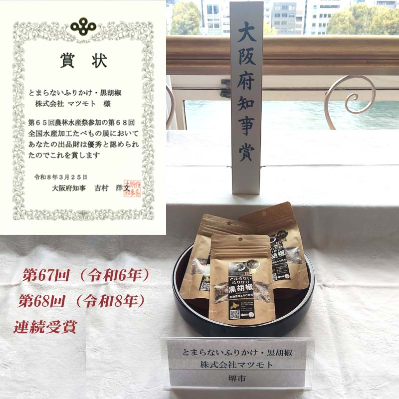北海道産とろろ昆布・塩こんぶと鰹がマッチしたとまらないふりかけです。 黒胡椒のさわやかな辛味が食欲をそそる、やみつきになるふりかけです。